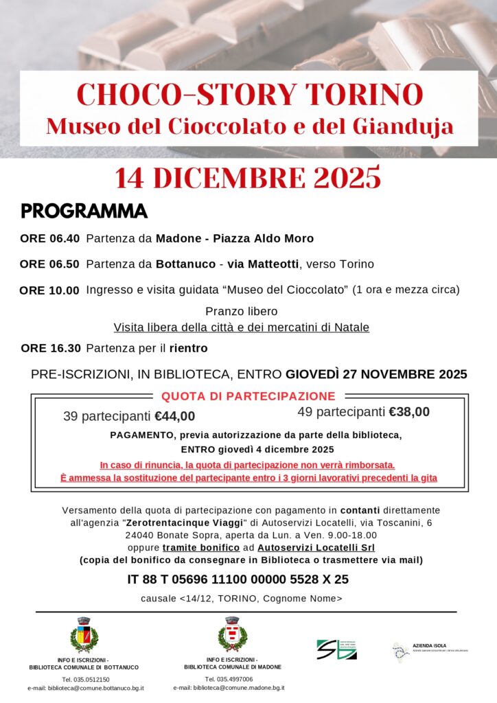 Choco-Story Torino Museo del Cioccolato e del Gianduja. Visita a Torino e al Museo del Cioccolato e del Gianduja domenica 14 dicembre 2025. Programma: Ore 06:40: Partenza da Madone – Piazza Aldo Moro; Ore 06:50: Partenza da Bottanuco – via Matteotti, verso Torino; Ore 10:00: Ingresso e visita guidata “Museo del Cioccolato” (1 ora e […]