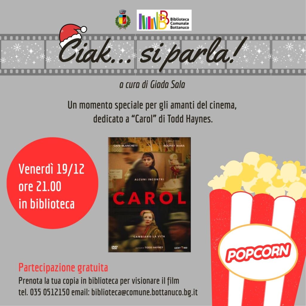 Un appuntamento speciale per gli amanti del cinema, dedicato a “Carol” di Todd Haynes. Venerdì 19/12, ore 21:00, presso la Biblioteca Comunale di Bottanuco.