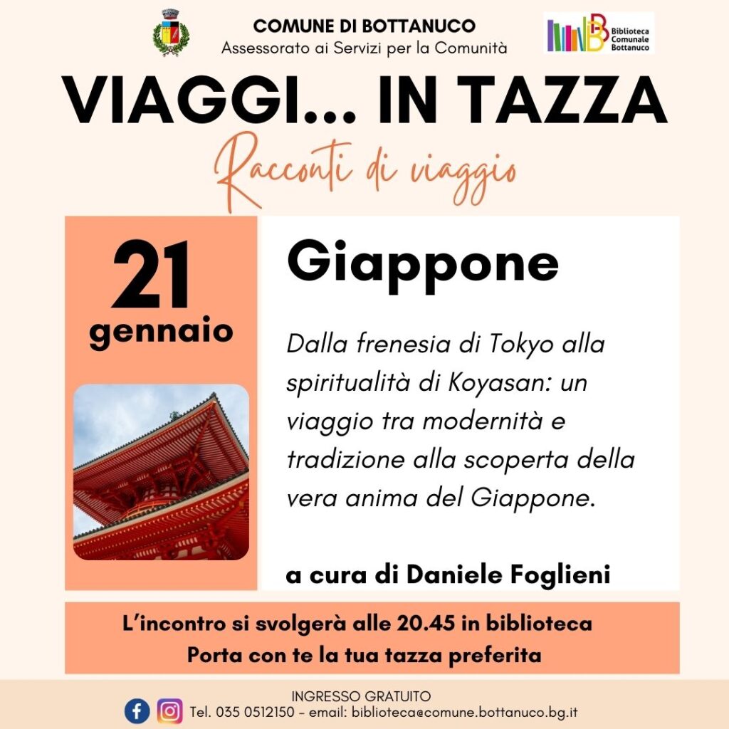 Tornano in biblioteca i racconti di viaggio… in tazza. Vi aspettiamo mercoledì 21/01 per un nuovo itinenrario a cura di Daniele Foglieni: il Giappone. Porta la tua tazza preferita, berremo insieme una tisana!