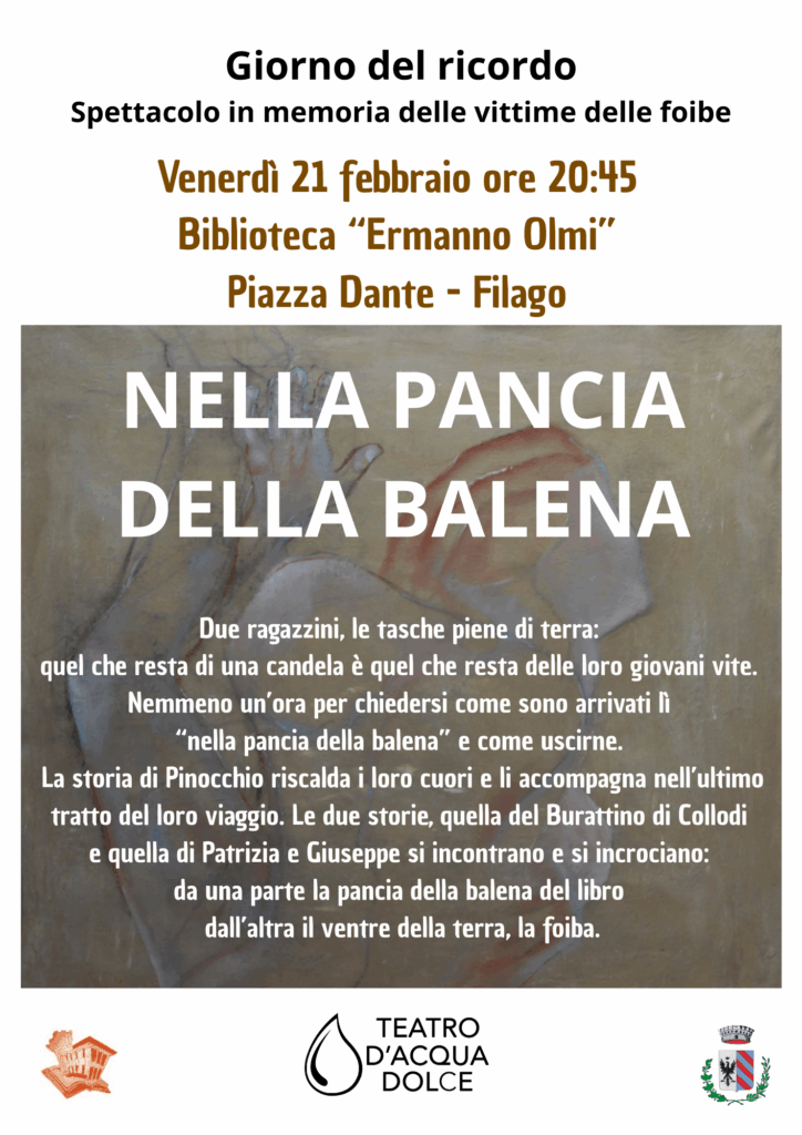 In occasione del Giorno del Ricordo, il Comune di Filago promuove lo spettacolo teatrale “Nella pancia della balena”, un momento di riflessione e memoria dedicato alle vittime delle foibe. Attraverso un intenso intreccio narrativo, lo spettacolo mette in dialogo la fiaba di Pinocchio con una storia reale di giovani vite spezzate, accompagnando il pubblico in […]