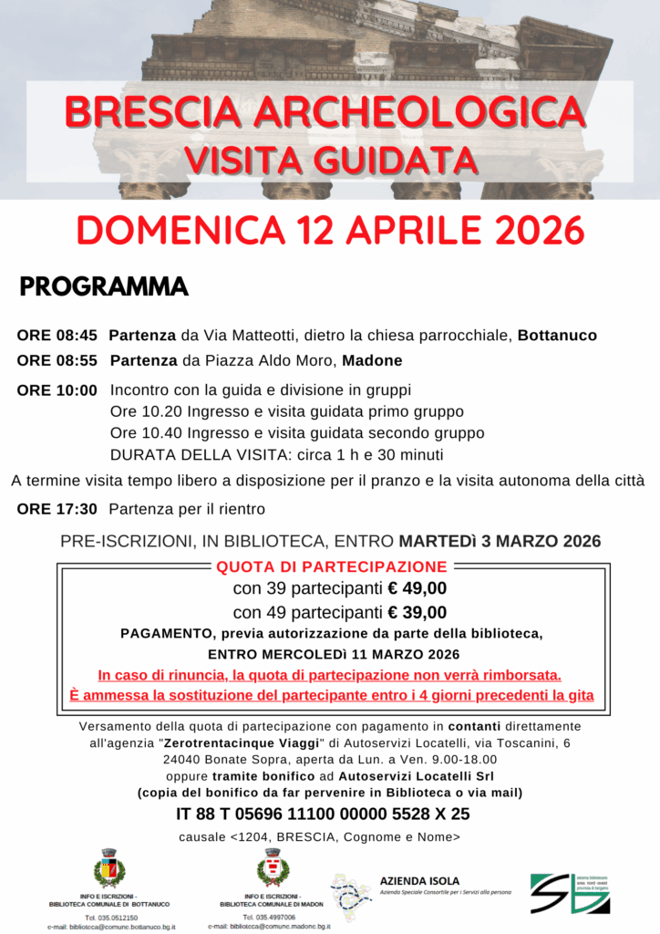 La Biblioteca organizza una visita guidata alla scoperta dell’area archeologica della città di Brescia. Programma della giornata: Ore 08:45 – Partenza da Via Matteotti (dietro la chiesa parrocchiale), Bottanuco Ore 08:55 – Partenza da Piazza Aldo Moro, Madone Ore 10:00 – Incontro con la guida e suddivisione in gruppi Ore 10:20 – Ingresso primo gruppo […]
