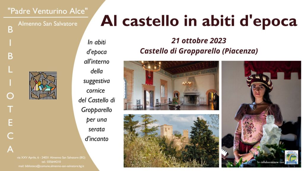 Costi: min. 15 iscritti € 180 cad.; max 20 iscritti € 160 cad. Il costo comprende: trasporto; noleggio costume; ingresso visita al castello; cena (escluso bevande) Termine iscrizioni 31 marzo Anticipo di € 50 all’atto dell’iscrizione. La data per la prova dell’abito d’epoca verrà definita in seguito.