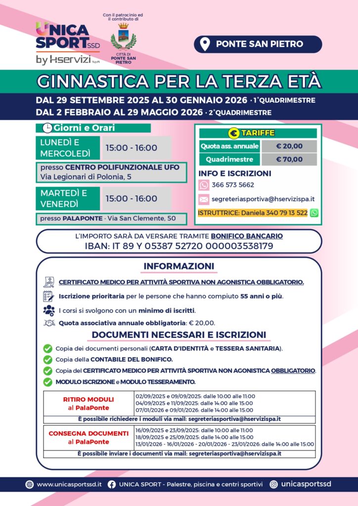 Corsi di pilates, ginnastica funzionale e ginnastica per la terza età presso Palaponte. I corsi si terranno da settembre 2025 a maggio 2026. Consultare il volantino in allegato per ulteriori informazioni.