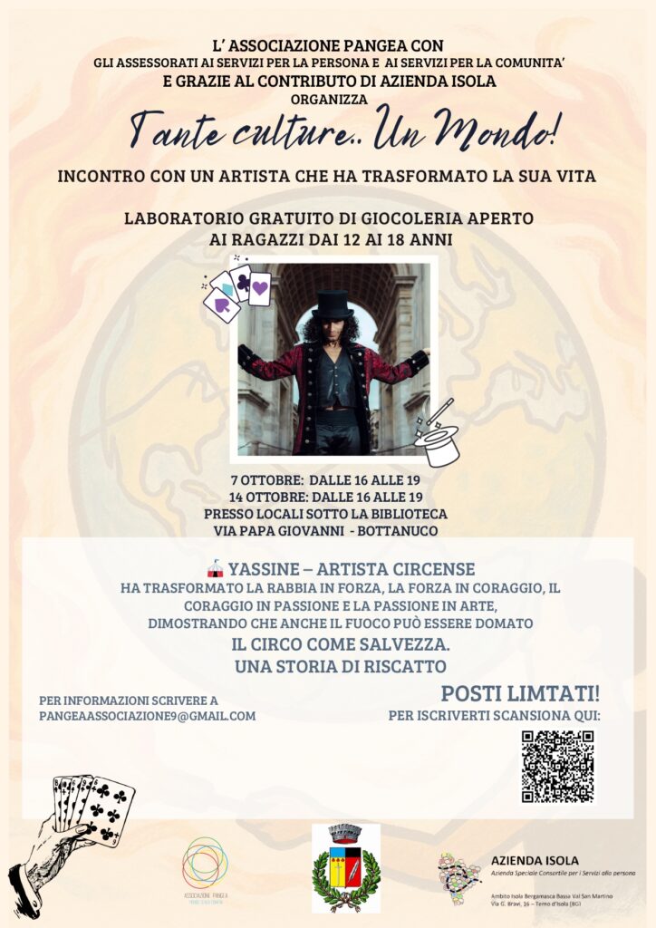 L’Associazione Pangea e il Comune di Bottanuco organizzano grazie al contributo di Azienda Isola due incontri con Yassine, artista circense che ha trasformato la rabbia in forza, la forza in coraggio, il coraggio in passione e la passione in arte. Laboratorio di giocoleria gratuito aperto ai ragazzi dai 12 ai 18 anni. 07 e