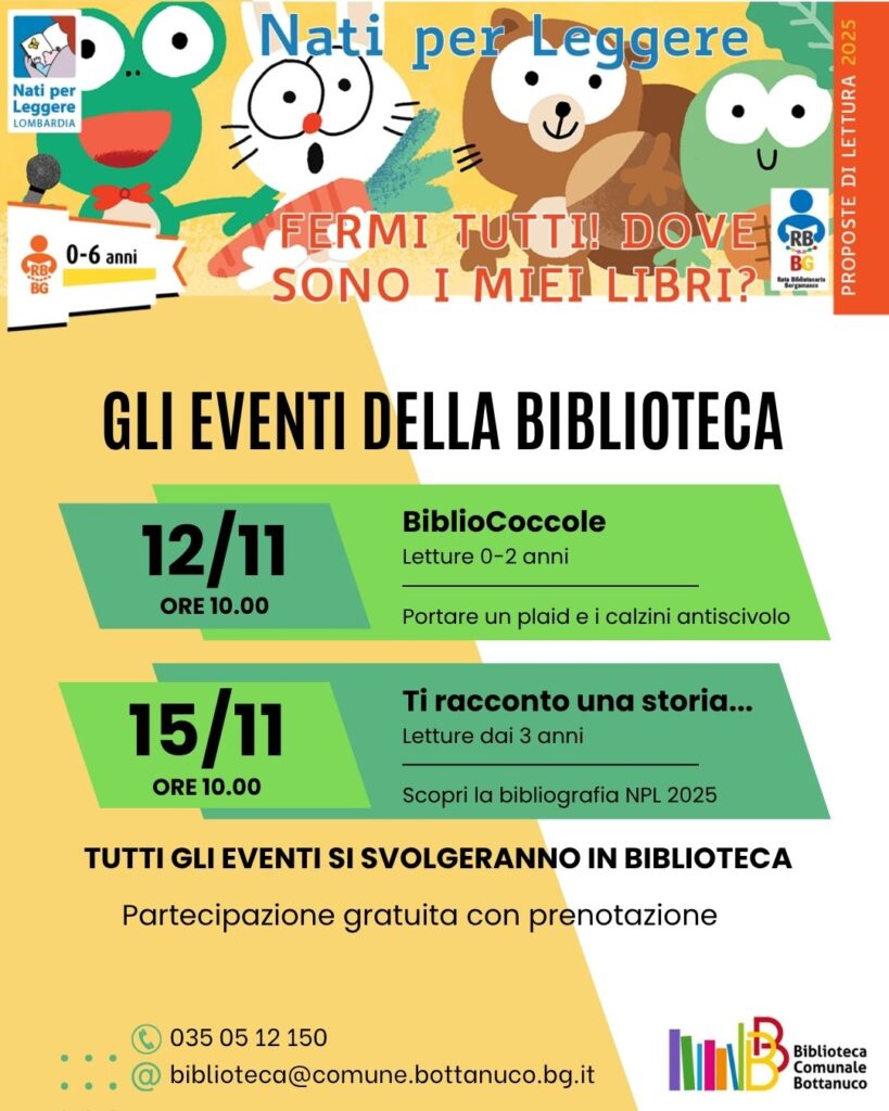 La Biblioteca di Bottanuco aderisce al programma Nati per Leggere per la promozione della lettura condivisa in famiglia sin dalla nascita. Ogni anno la Rete Bibliotecaria Bergamasca propone una bibliografia tematica in occasione di Nati per Leggere in festa che si svolge ogni anno a novembre con attività, letture e incontri per i piccoli lettori