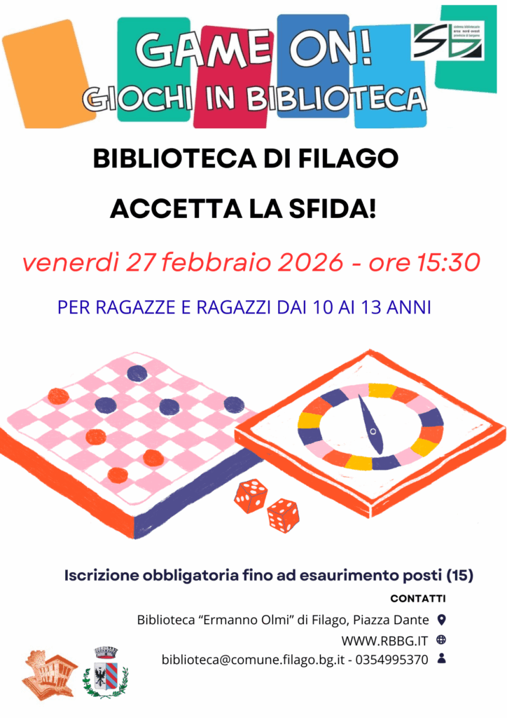 La Biblioteca Comunale “Ermanno Olmi” di Filago propone “Game On! Giochi in biblioteca”, un pomeriggio dedicato al gioco da tavolo e alla socialità, pensato per ragazze e ragazzi dai 10 ai 13 anni. L’iniziativa invita i partecipanti a mettersi alla prova con giochi di strategia, logica e collaborazione, favorendo il divertimento, l’incontro e lo spirito