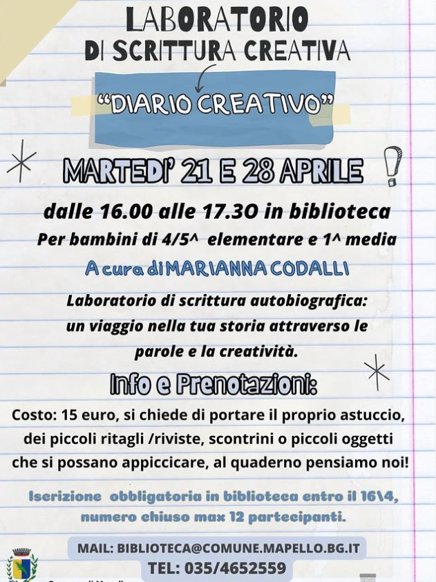 Martedì 21 e martedì 28 aprile dalle 16:00 alle 17:30 presso la biblioteca di Mapello. Per i bambini di 4°, 5° elementare e 1° media. Portare il proprio astuccio e dei piccoli ritagli di riviste, scontrini o piccoli oggetti da appiccicare.