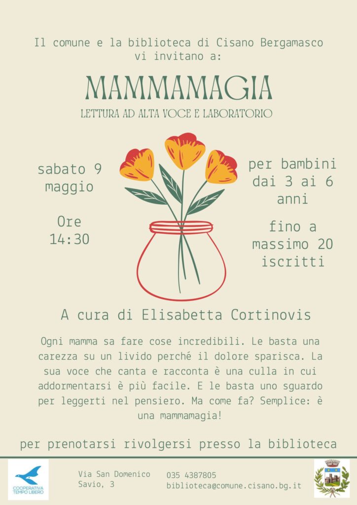 Lettura ad alta voce e laboratorio a cura di Elisabetta Cortinovis Sabato 9 maggio alle ore 14.30 presso la biblioteca di Cisano Bergamasco, lettura ad alta voce e laboratorio “Mammamagia”. Ogni mamma sa fare cose incredibili. Le basta una carezza su un livido perché il dolore sparisca. La sua voce che canta e racconta è