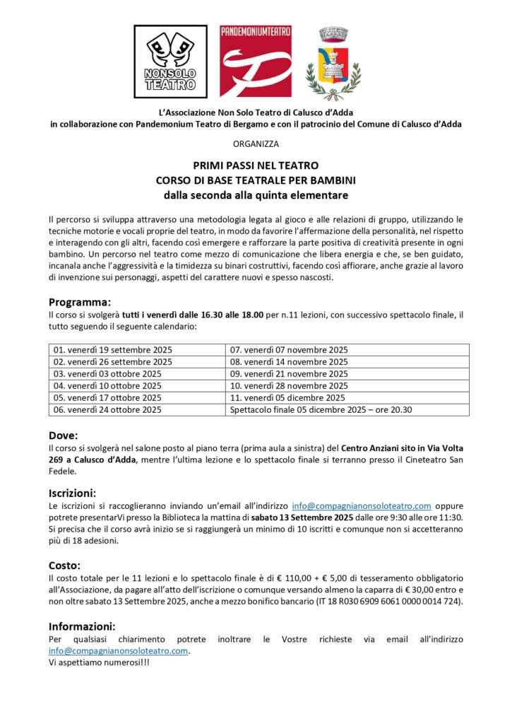 Sono aperte le iscrizioni ai corsi di teatro per bambini dalla seconda alla quinta elementare e per ragazzi dalla prima media ai 14 anni. Le iscrizioni si raccoglieranno presso la Biblioteca nella mattinata di sabato 13 settembre 2025 dalle ore 9.30 alle ore 11.30. I corsi avranno inizio se raggiungeranno ognuno un minimo di 10 iscritti e