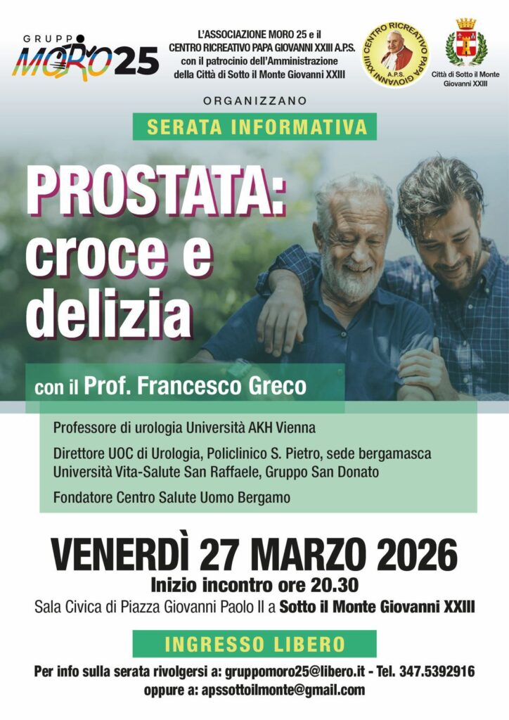 L’associazione Gruppo Moro 25 e il Centro Ricreativo Papa Giovanni XXIII A.P.S., con il patrocinio del Comune di Sotto il Monte Giovanni XXIII, organizzano una serata informativa dedicata alla salute maschile dal titolo “Prostata: croce e delizia”. L’incontro sarà tenuto dal professor Francesco Greco, docente di urologia presso l’AKH Vienna, direttore della UOC di Urologia […]