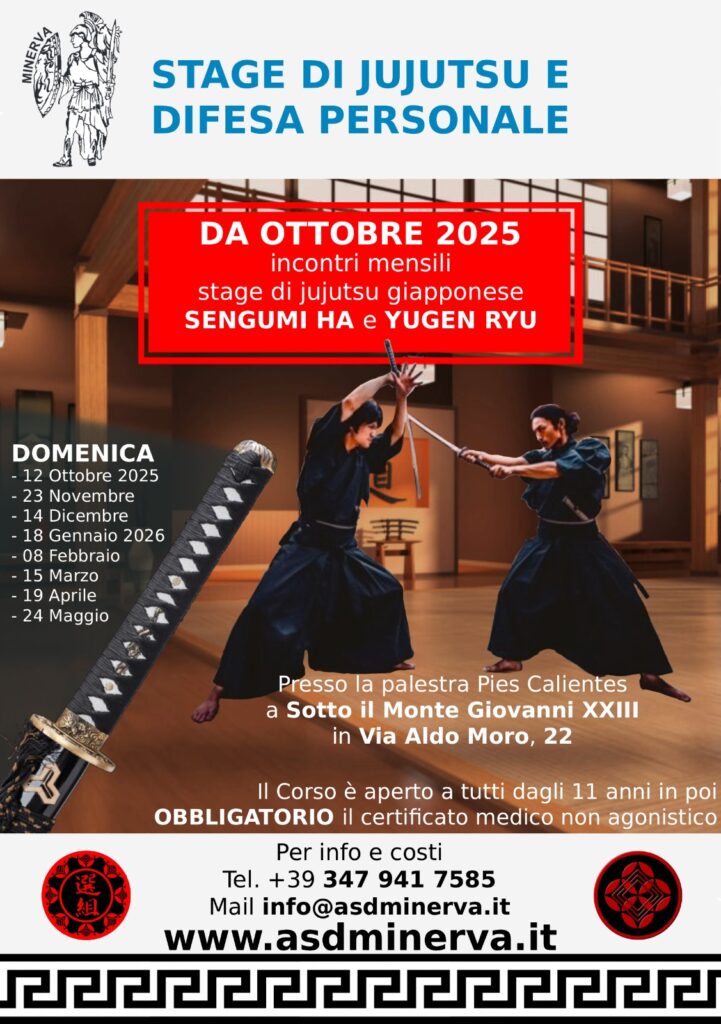 Da Ottobre 2025, incontri mensili stage di jujutsu giapponese Sengumi Ha e Yugen Ryu Presso la palestra Pies Calientes a Sotto il Monte Giovanni XXIII in via Aldo Moro, 22 Domenica: 12 Ottobre 2025 23 Novembre 14 Dicembre 18 Gennaio 2026 08 Febbraio 15 Marzo 19 Aprile 24 maggio Corso aperto a tutti dagli 11