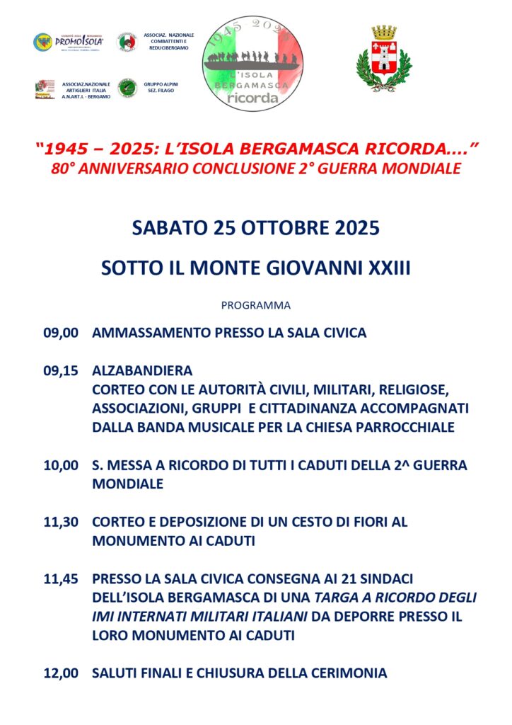 Sabato 25 ottobre 2025 – Sotto il Monte Giovanni XXIII Programma: Ore 09:00: Ammassamento presso la Sala Civica Ore 09:15: Alzabandiera. Corteo con le Autorità civili, militari, religiose, associazioni, gruppi e cittadinanza accompagnati dalla banda musicale per la Chiesa Parrocchiale Ore 10:00 S. Messa a ricordo di tutti i caduti della 2° Guerra Mondiale Ore