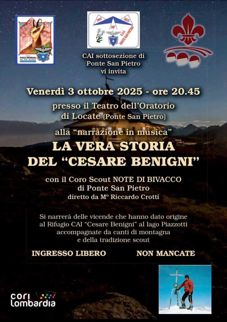 Il Cai Ponte San Pietro organizza per venerdì 3 ottobre 2025 ore 20:45 presso il Teatro dell’Oratorio di Locate: “La vera storia del Cesare Benigni”, una narrazione in musica che vi porterà alla scoperta della figura di Cesare Benigni, tra parole e note, accompagnata dal Coro Scout “Note di bivacco”con canti di montagna e della tradizione scout.