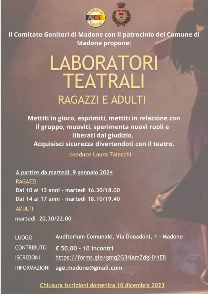 L’Associazione Genitori, con il patrocinio del Comune di Madone, propone Laboratori teatrali per ragazzi e per adulti Per iscriversi https://docs.google.com/forms/d/e/1FAIpQLSd8Y9UCXh0dHfObTomBIxjSN8u0KbwoQ7cpBIq6DwE0OgVhXQ/viewform