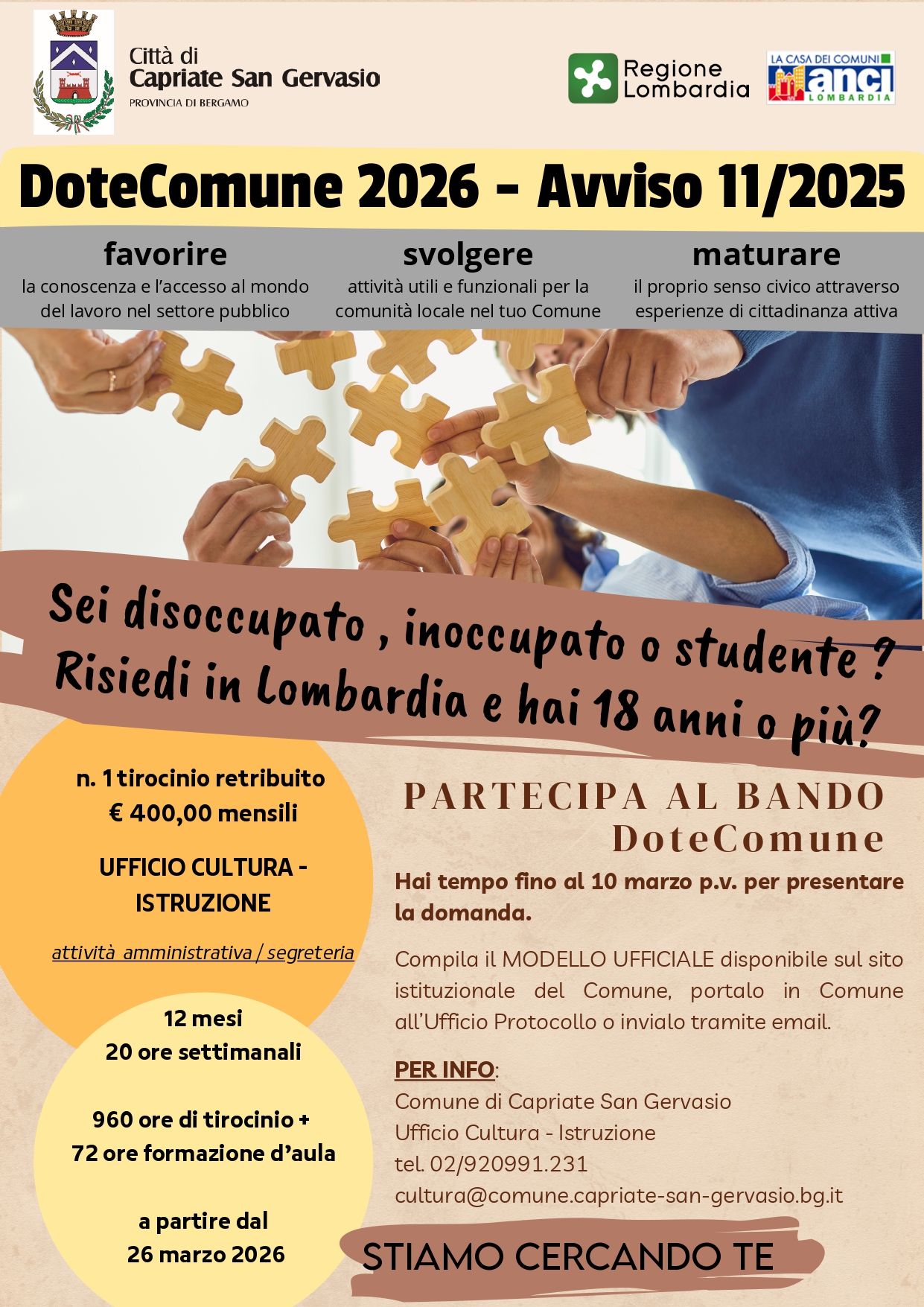 In data 24 febbraio 2026, è stato pubblicato il bando Dote Comune 2026 – Avviso 11/2025.