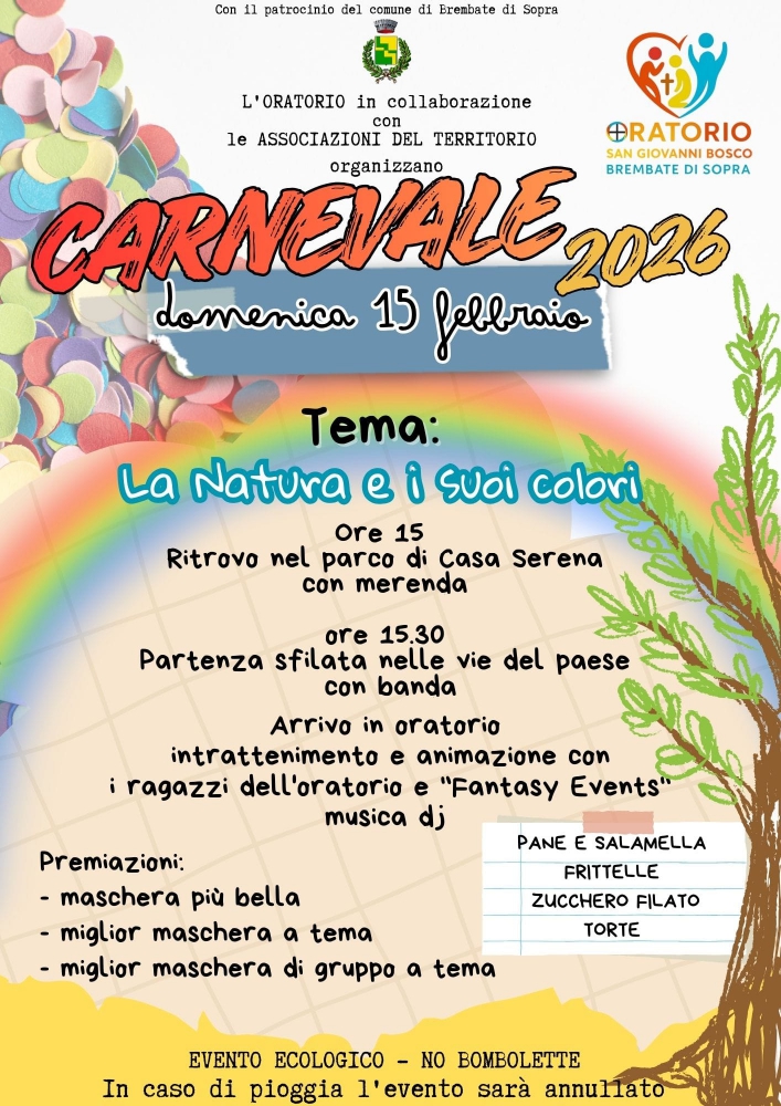 L'Oratorio in collaborazione con le Associazioni del Territorio e con il patrocinio del Comune di Brembate di Sopra organizzano "Carnevale 2026" con tema "La natura e i suoi colori" domenica 15 febbraio 2026 alle ore 15.00.