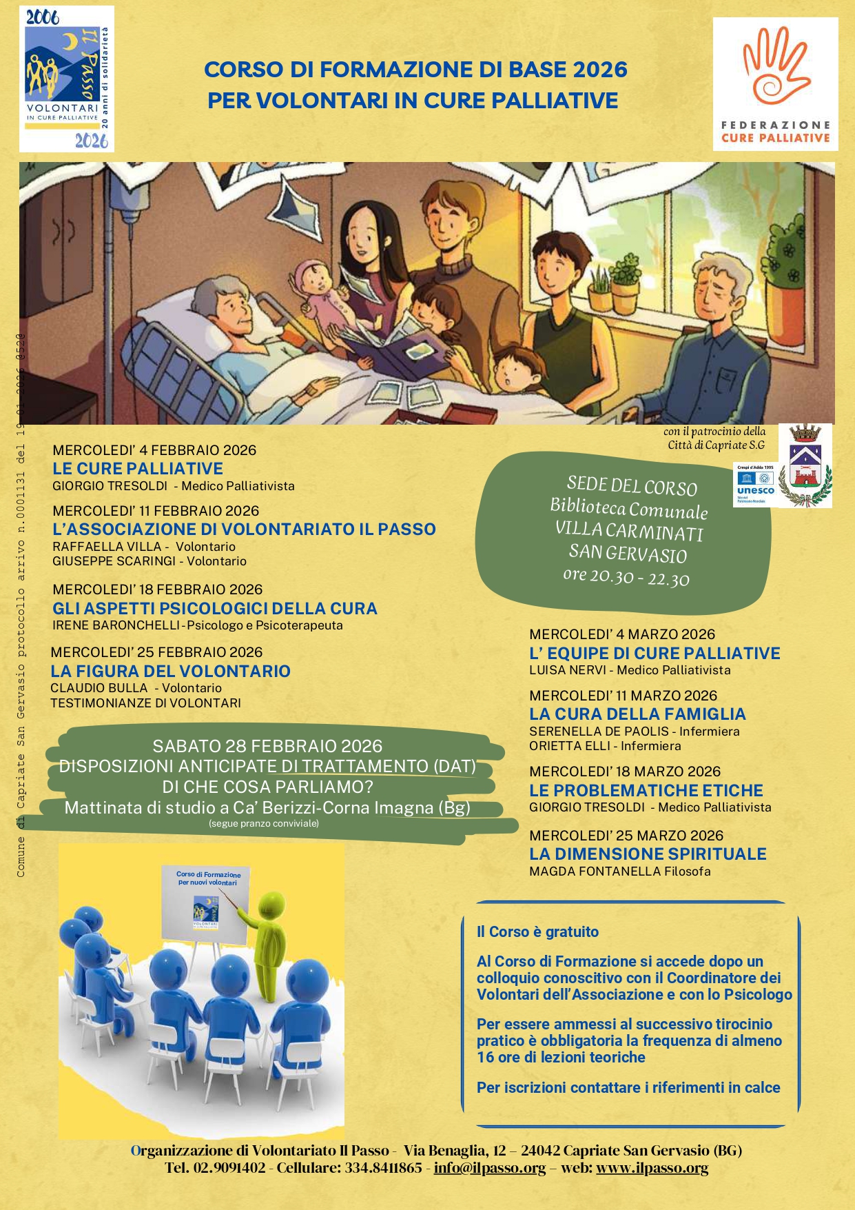 L’Organizzazione di Volontariato Il Passo, con il patrocinio della Città di Capriate San Gervasio, organizza il corso per neo volontari e volontari sulle cure palliative.