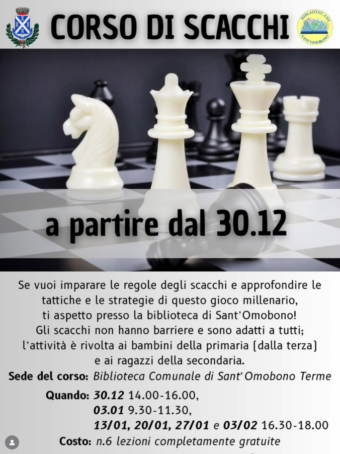 Con il prezioso contributo del Bim, partirà a breve un corso di scacchi per i nostri giovani, completamente gratuito. Iscrizione presso la biblioteca di Sant’Omobono Terme.