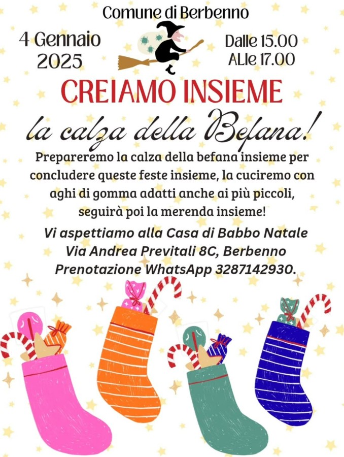 Prepariamo la calza della Befana, la cuciremo con aghi di gomma adatti anche ai più piccoli e, al termine, faremo merenda tutti insieme!