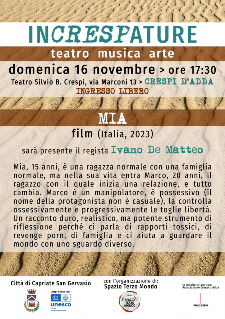 Domenica 16 Novembre alle ore 17.30, presso il Teatro Silvio B. Crespi, verrà proiettato il film "Mia" con la presenza del regista Ivano De Matteo.