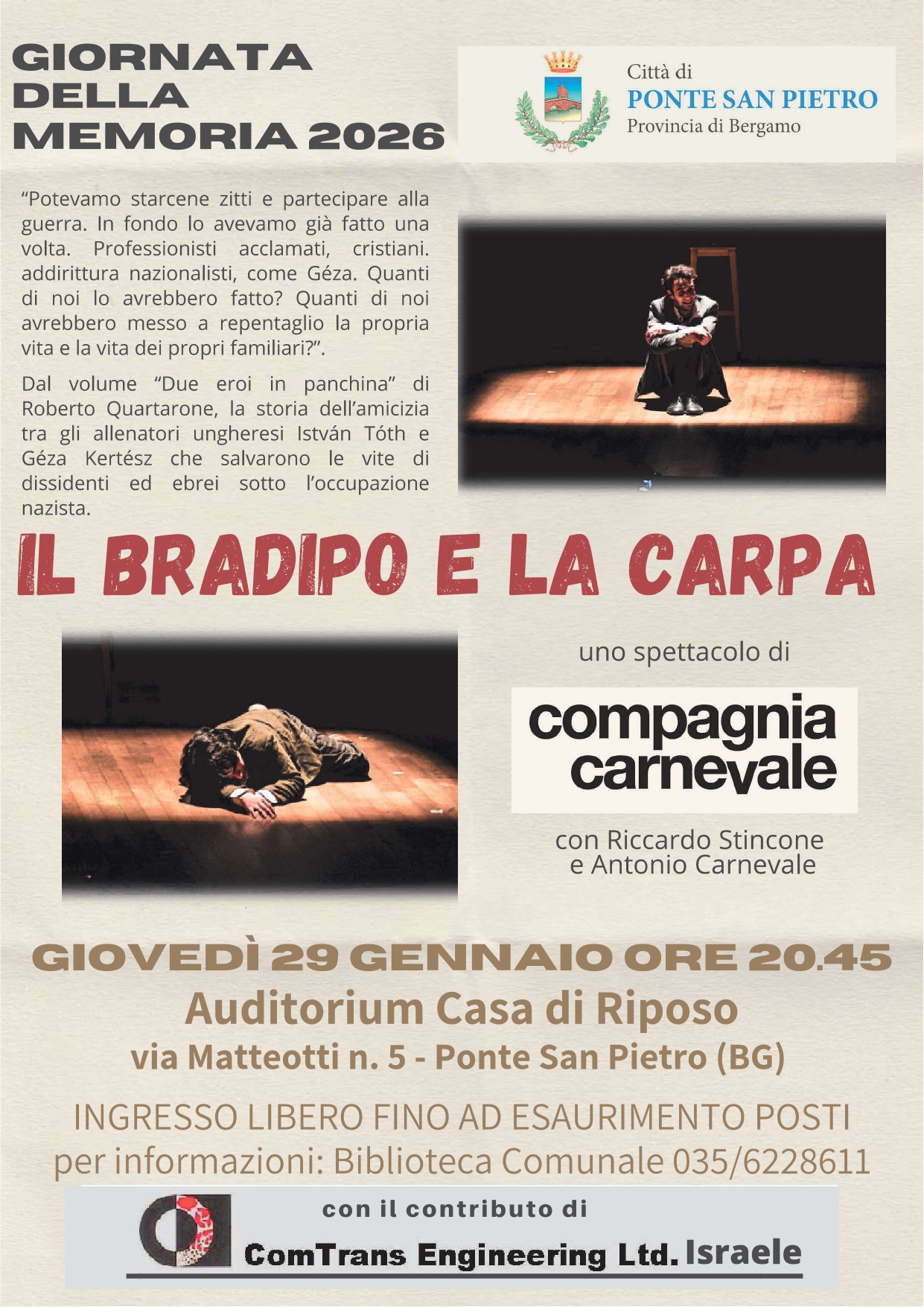 AGGIORNAMENTO IMPORTANTE – GIORNATA DELLA MEMORIA: per cause organizzative, lo spettacolo teatrale “Il Bradipo e la Carpa” subisce una variazione di data e luogo. La nuova data è Giovedì 29 gennaio, alle 20.45 presso l'Auditorium della Casa di Riposo, in via Matteotti, 5 - Ponte san Pietro.