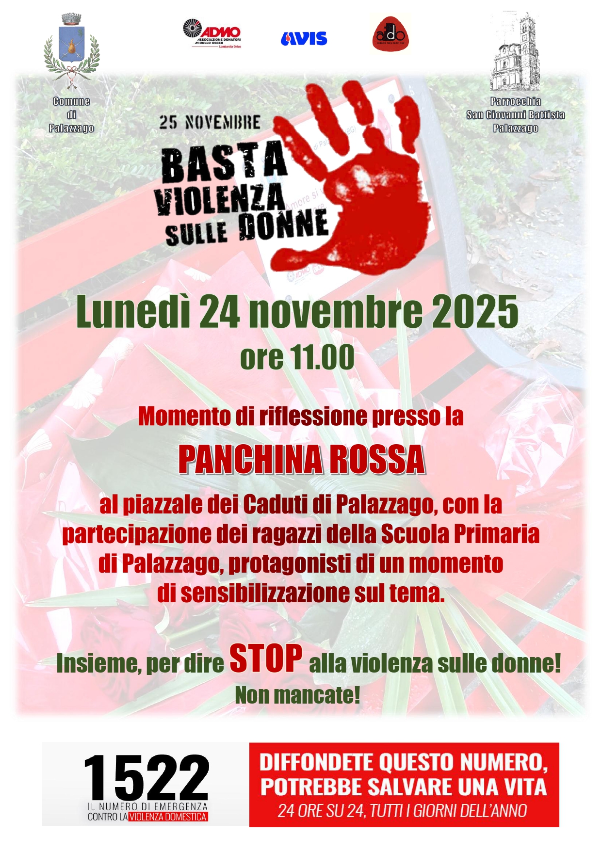 ore 11:00 : momento di riflessione presso la PANCHINA ROSSA al piazzale dei Caduti di Palazzago, con la partecipazione delle ragazze e dei ragazzi della Scuola Primaria