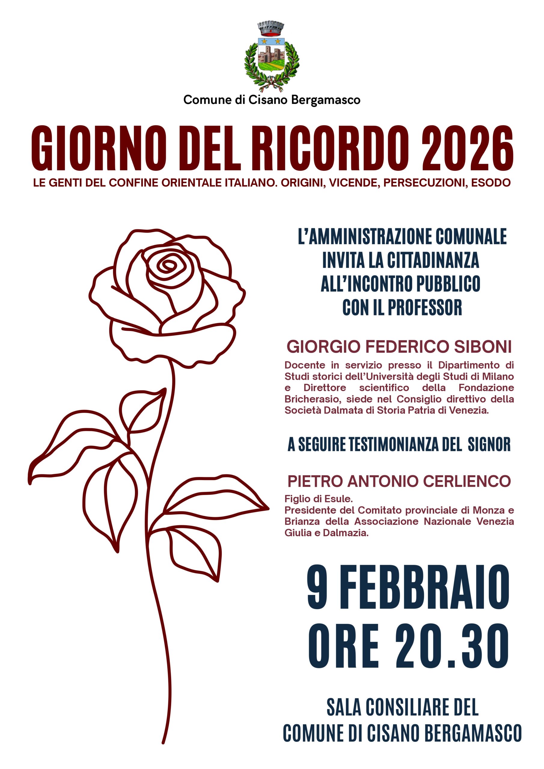 Lunedì 9 febbraio alle ore 20.30 presso la Sala Consiliare, incontro pubblico con il Professor Giorgio Federico Siboni, docente in servizio presso il Dipartimento di Studi storici dell'Università degli Studi di Milano e Direttore scientifico della Fondazione Bricherasio, siede nel Consiglio direttivo della Società Dalmata di Storia Patria di Venezia.