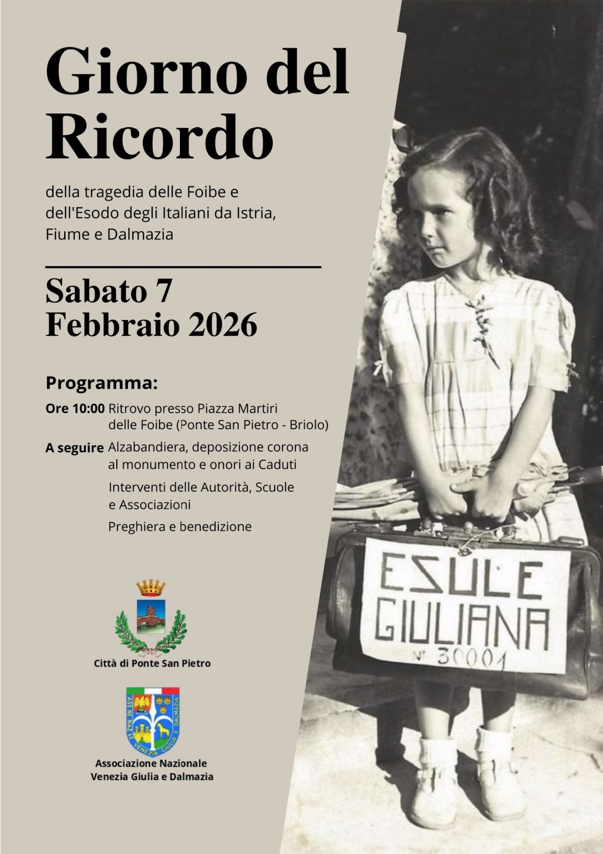 Sabato 7 febbraio 2026, ritrovo ore 10:00 presso Piazza Martiri delle Foibe (Ponte san Pietro-Briolo).