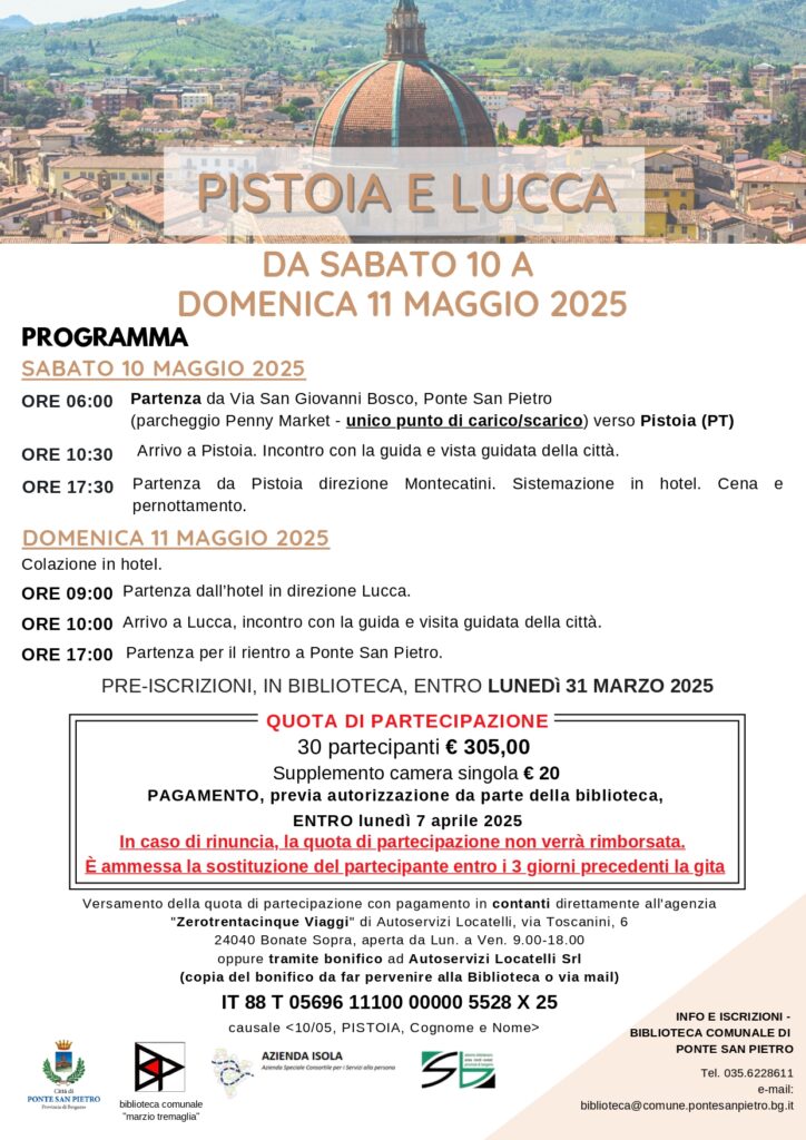 La Biblioteca di Ponte San Pietro organizza una gita presso Pistoia e Lucca per sabato 10 e domenica 11 maggio 2025.