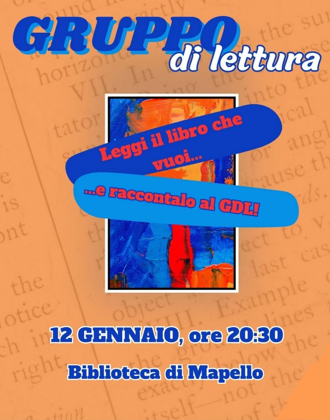 La Biblioteca di Mapello ospita un nuovo incontro del Gruppo di Lettura: un appuntamento aperto a tutti gli appassionati di libri. I partecipanti sono invitati a leggere il libro che preferiscono e a condividerne il racconto e le impressioni con il gruppo.