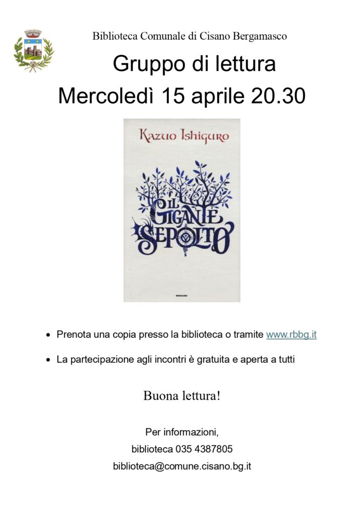 Mercoledì 15 aprile ore 20.30 presso la biblioteca di Cisano Bergamasco, gruppo di lettura.