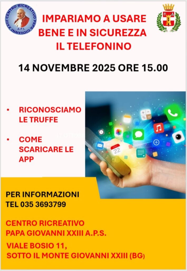 Vuoi imparare a usare il tuo smartphone in modo semplice e sicuro? Ti aspettiamo venerdì 14 novembre 2025 alle ore 15:00, Centro Ricreativo Papa Giovanni XXIII A.P.S. (Viale Bosio 11, Sotto il Monte Giovanni XXIII - BG).