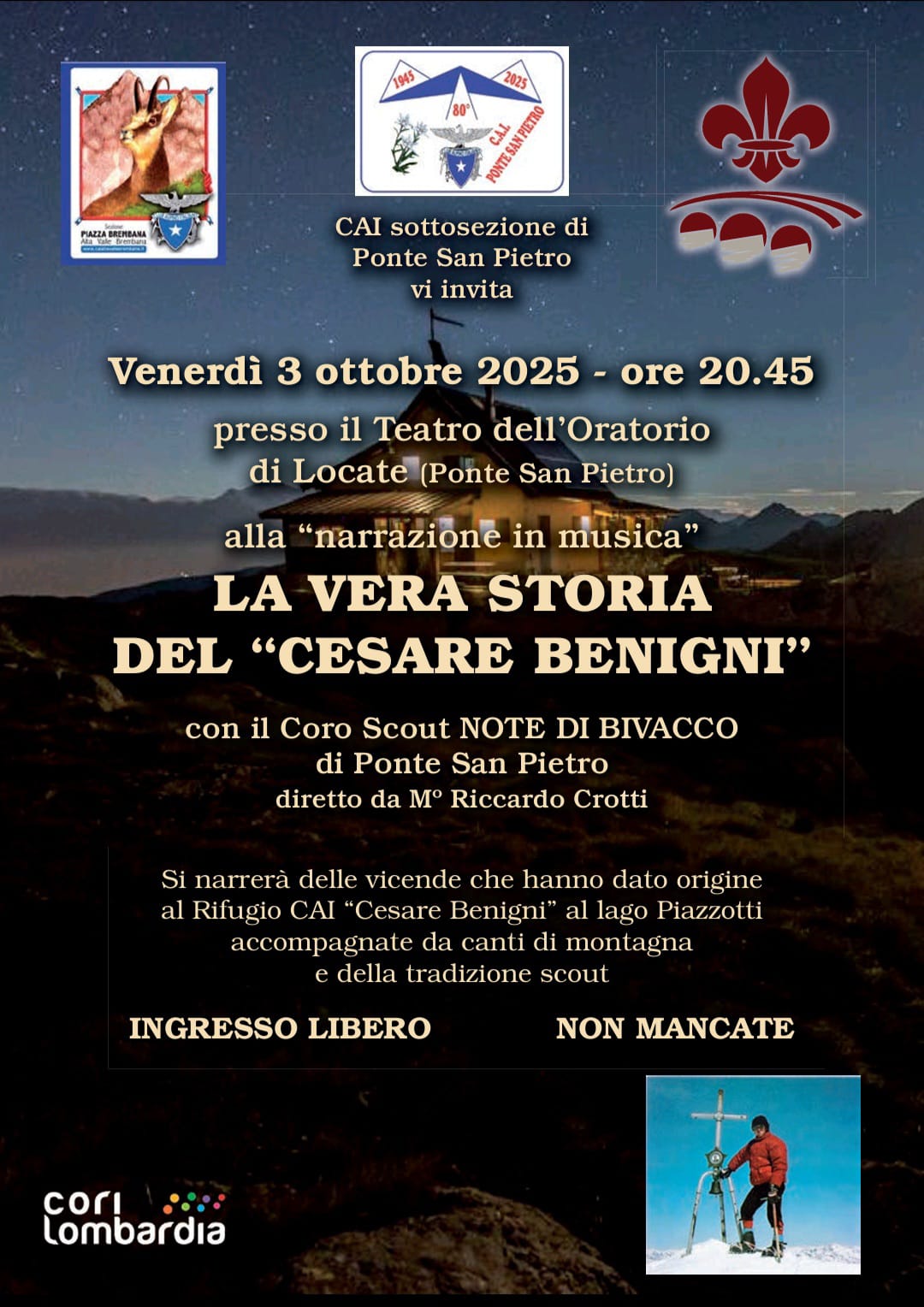 "La vera storia del Cesare Benigni", una narrazione in musica che vi porterà alla scoperta della figura di Cesare Benigni, tra parole e note, accompagnata dal Coro Scout “Note di bivacco”con canti di montagna e della tradizione scout.