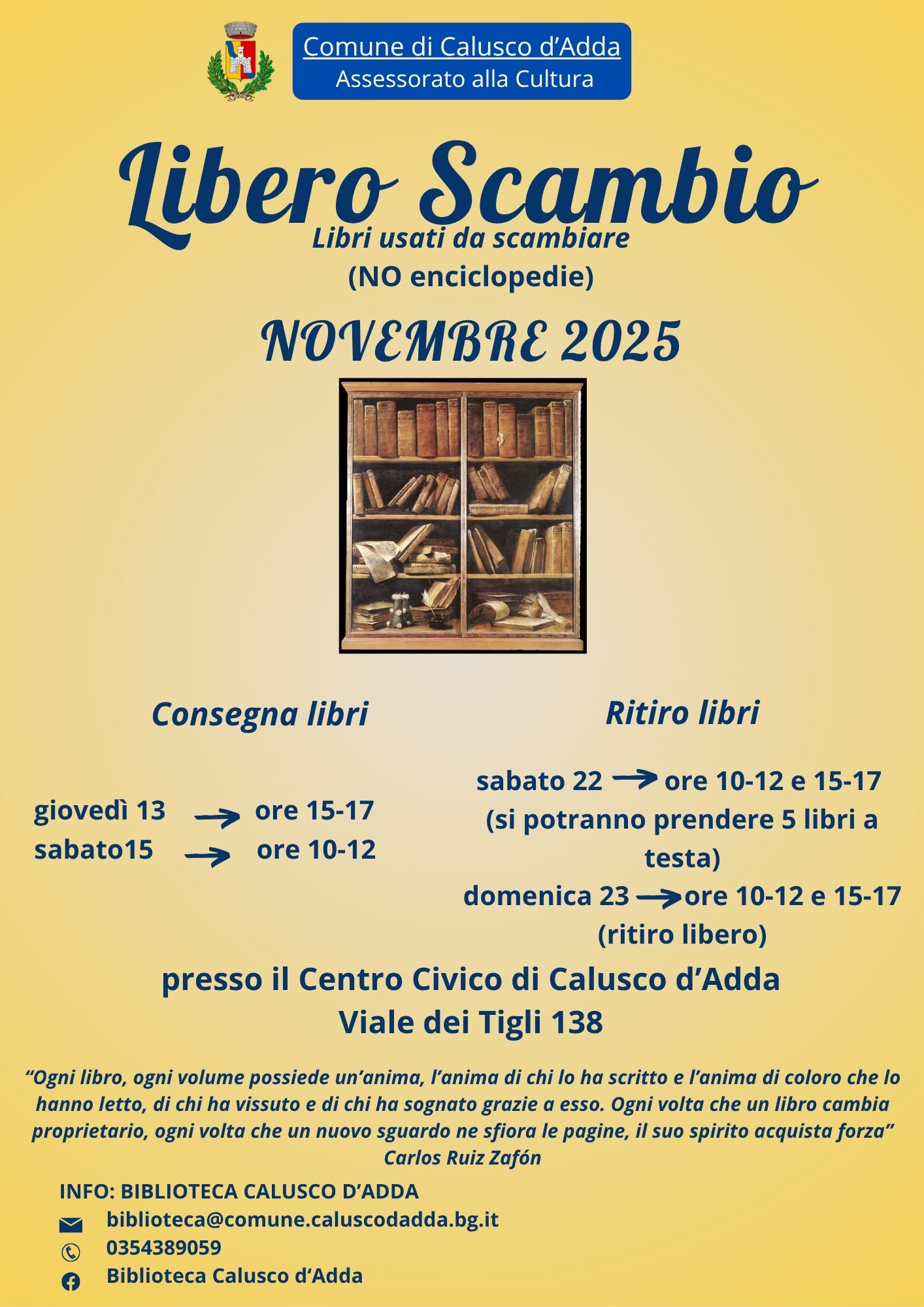 Come da tradizione anche quest'anno si svolgerà a Calusco d'Adda, presso il Centro Civico, il libero scambio di libri.