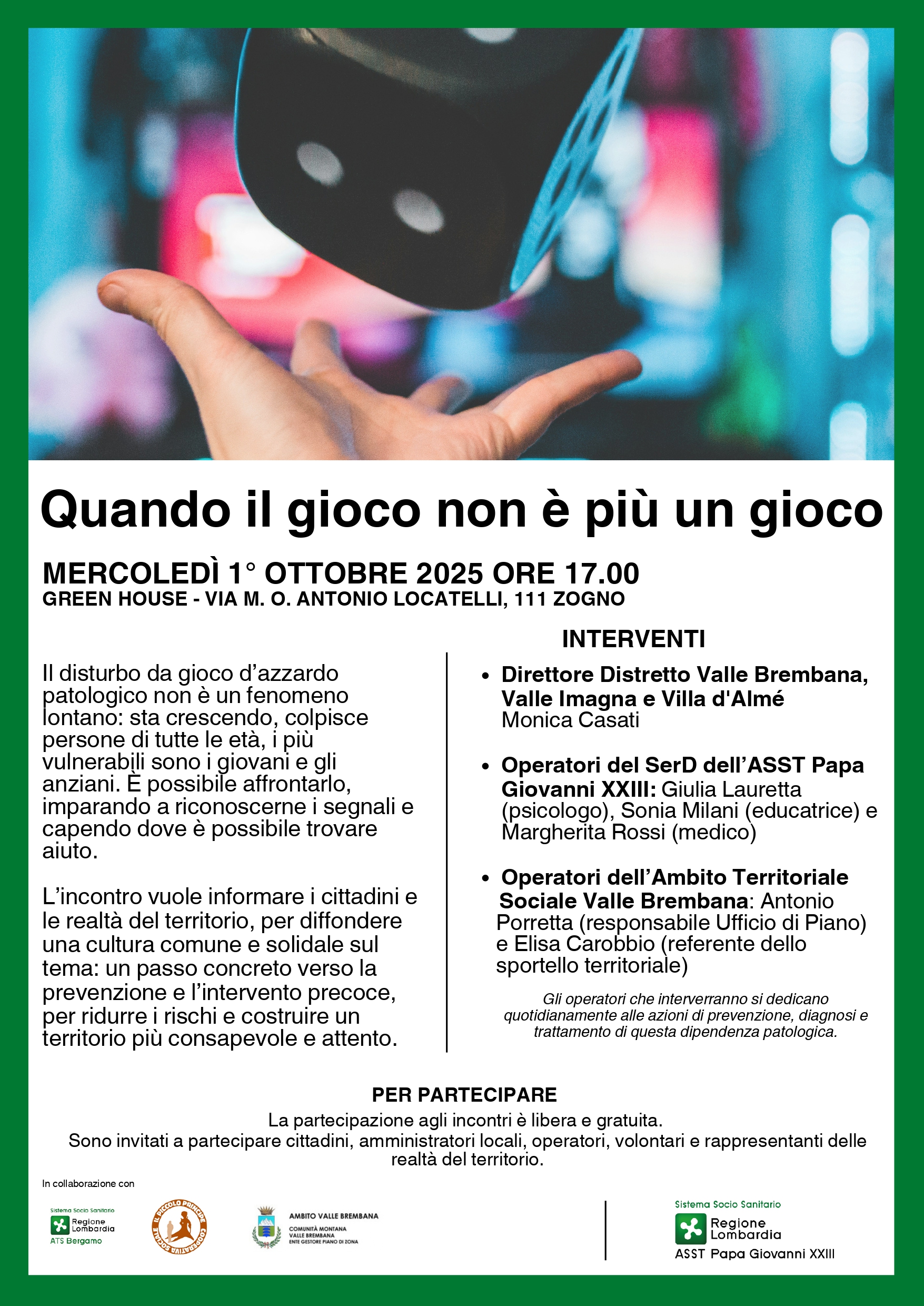 L’incontro vuole informare i cittadini e le realtà del territorio, per diffondere una cultura comune e solidale sul tema: un passo concreto verso la prevenzione e l’intervento precoce, per ridurre i rischi e costruire un territorio più consapevole e attento.