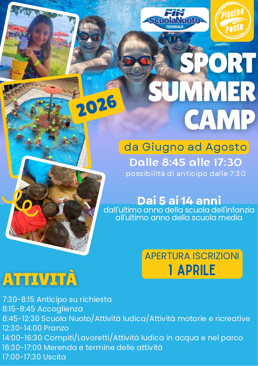 Iscrizioni presso la reception della piscina. E' obbligatorio presentare un certificato medico per attività sportiva non agonistica (dai 6 anni) entro il primo giorno del Camp. Sulla base della settimana di interesse, è possibile iscriversi fino al mercoledì immediatamente precedente. E' previsto uno sconto del 10% per coloro che risiedono nei comuni convenzionati e/o sono dipendenti di aziende convenzionate o familiari di primo grado.
