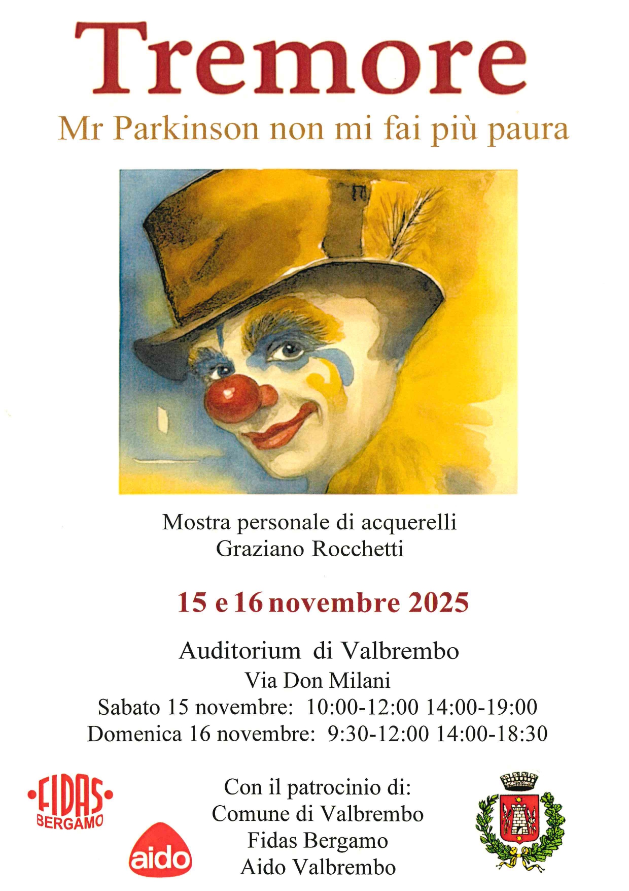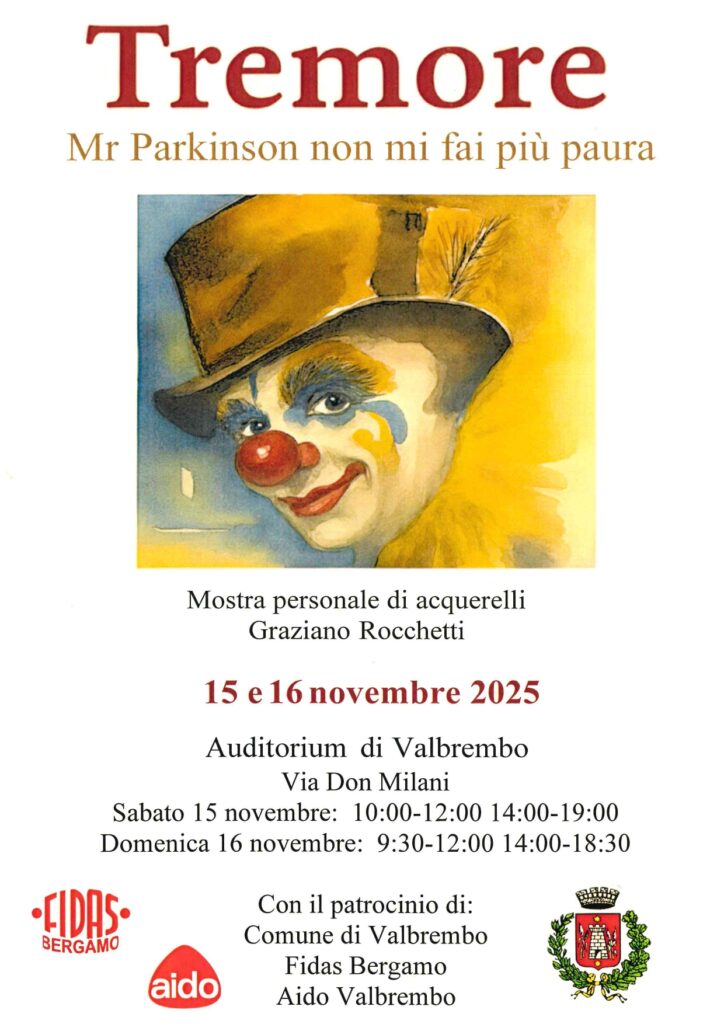 In occasione della Giornata Nazionale Parkinson del 26 Novembre, Il giorno 15 Novembre dalle ore 10:00-12:00 alle ore 14:00-19:00, e il giorno 16 Novembre dalle ore 9:30-12:00 alle ore 14:00 alle ore 18:30, presso l'auditorium comunale, si terrano due giornate dedicate alla mostra personale di acquerelli creati da Graziano Rocchetti.