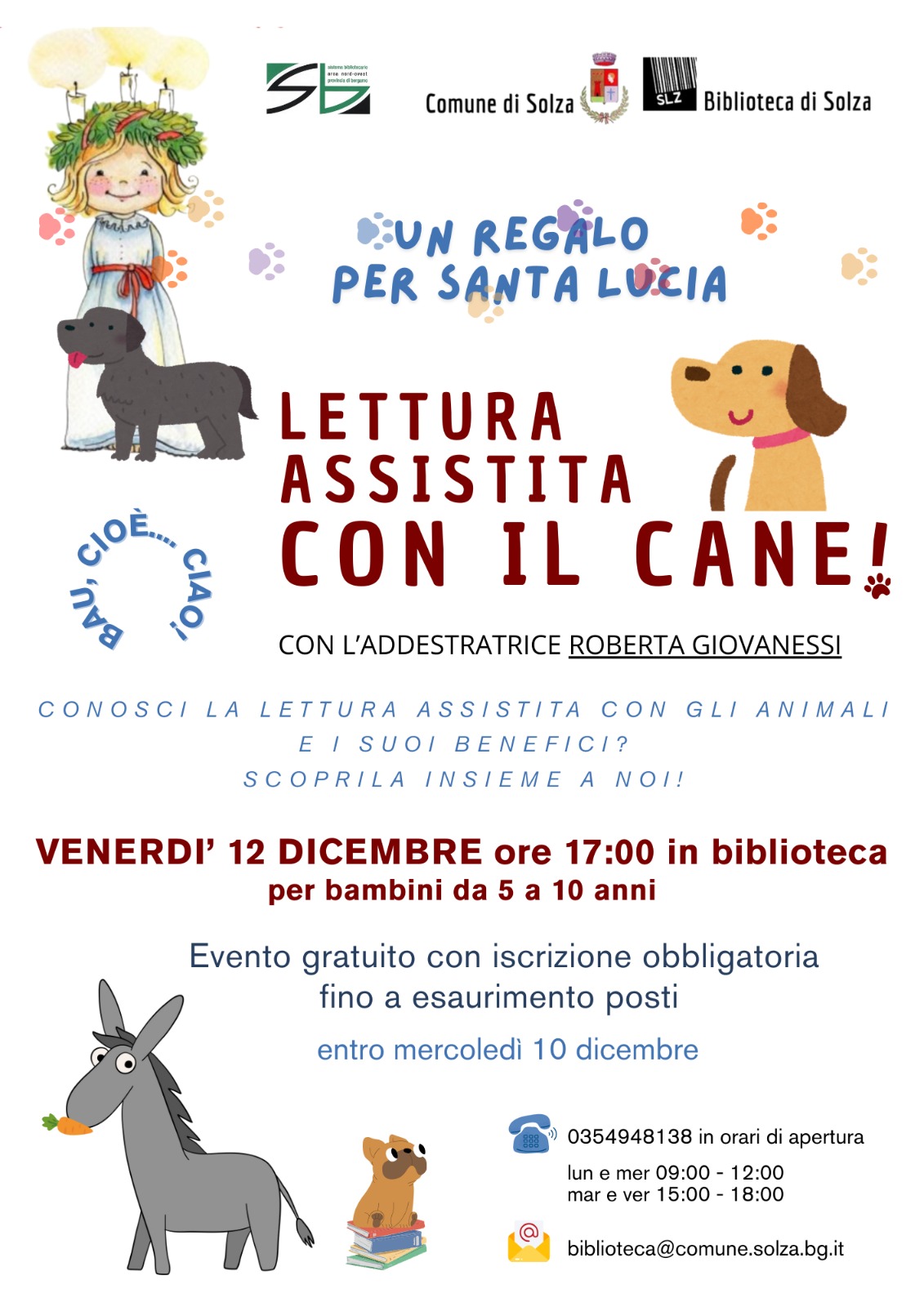 Vieni in biblioteca venerdì 12 dicembre a partire dalle 17:00! Roberta ed i suoi amici a 4 zampe ti aspettano per leggere insieme!