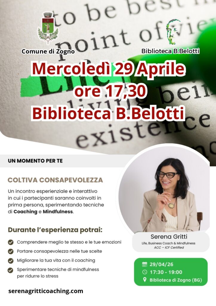Mercoledì 29 aprile alle ore 17.30, presso la Biblioteca, si terrà “Coltiva consapevolezza”, un’esperienza interattiva guidata dalla coach Serena Gritti. L’incontro è pensato come uno spazio pratico e coinvolgente, in cui i partecipanti potranno mettersi in gioco in prima persona, sperimentando tecniche di coaching e mindfulness per migliorare il proprio equilibrio emotivo e la qualità […]
