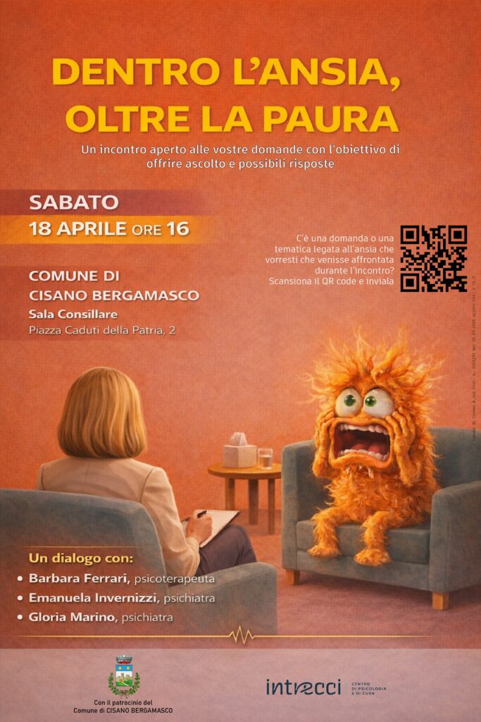 Un incontro aperto alle vostre domande con l’obiettivo di offrire ascolto e possibili risposte. Sabato 18 aprile alle ore 16.00 presso la sala consiliare del Comune di Cisano Bergamasco. Un dialogo con: Barbara Ferrari, psicoterapeuta Emanuela Invernizzi, psichiatra Gloria Marino, psichiatra