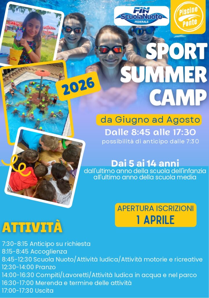 Iscrizioni presso la reception della piscina. E’ obbligatorio presentare un certificato medico per attività sportiva non agonistica (dai 6 anni) entro il primo giorno del Camp. Sulla base della settimana di interesse, è possibile iscriversi fino al mercoledì immediatamente precedente. E’ previsto uno sconto del 10% per coloro che risiedono nei comuni convenzionati e/o sono