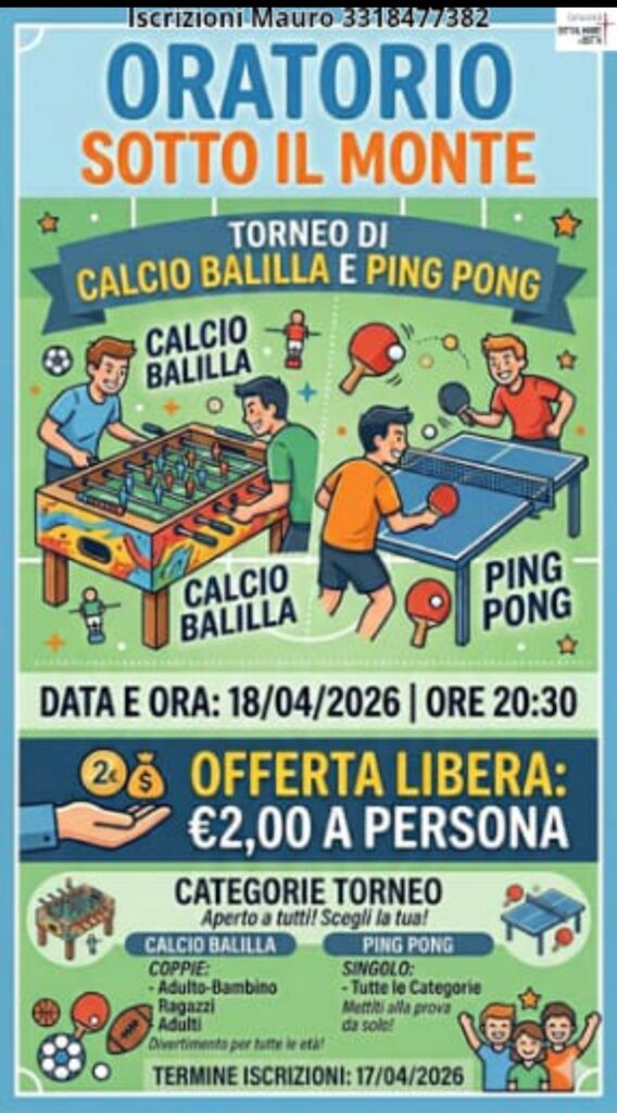 Sabato 18 aprile alle ore 20:30 presso l’oratorio di Sotto il monte. Le iscrizioni si chiudono venerdì 17 aprile. Offerta libera di 2 euro a persona.