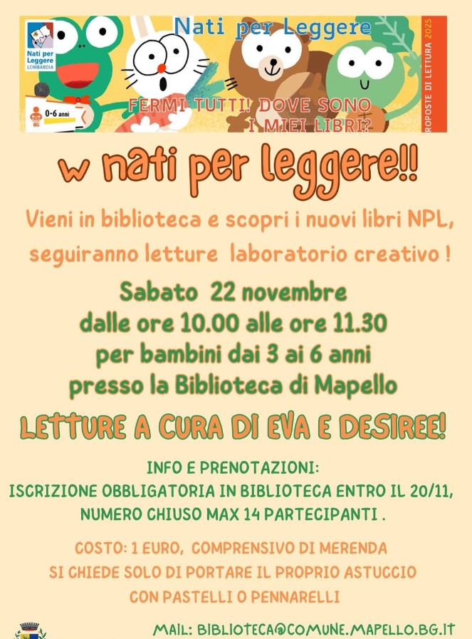 Sabato 22 novembre 2025, ore 10:00-11:30 presso la Biblioteca Comunale, letture per bambini dai 3 ai 6 anni. Info e prenotazioni: 0354652559 biblioteca@comune.mapello.bg.it Iscrizione obbligatoria entro il 20 novembre.