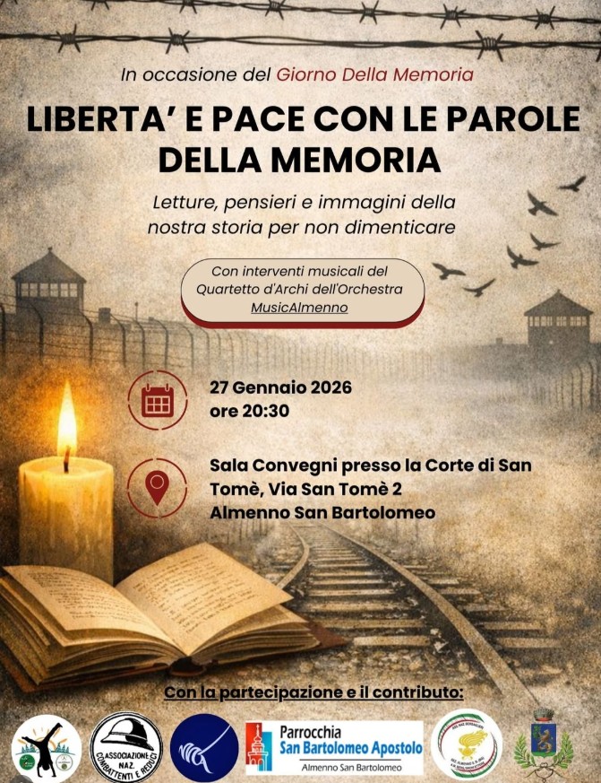 Letture, pensieri e immagini della nostra storia per non dimenticare; appuntamento a martedì 27 gennaio 2026, alle ore 20.30 Una serata di riflessione accompagnata dagli interventi musicali del Quartetto d’Archi dell’Orchestra MusicAlmenno.