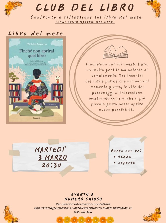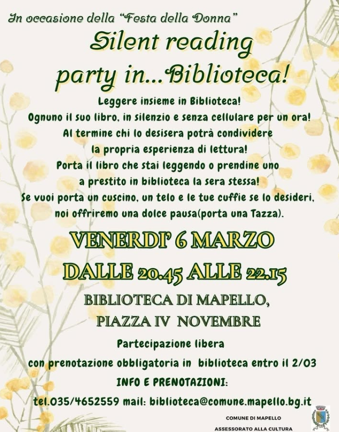 leggere insieme in biblioteca: ognuno il suo libro in silenzio, senza cellulare per un ora. al termine, chi lo desidera, può condividere la propria esperienza. venerdì 6 marzo dalle 20:45 alle 22:15. partecipazione libera con prenotazione obbligatoria entro il 2 marzo.