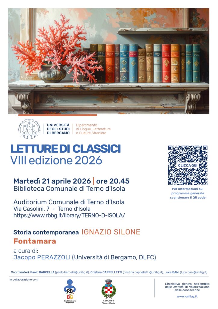 Siamo lieti di invitarvi alla VIII edizione di “Letture di classici” a cura dell’Università degli Studi di Bergamo. L’incontro si terrà martedì 21 aprile alle ore 20.45 presso l’Auditorium comunale, via Casolini 7. Durante l’incontro si discuterà del libro “Fontamara” di Ignazio Silone. A cura di Jacopo Perazzoli (Università di Bergamo). Ingresso libero e gratuito.