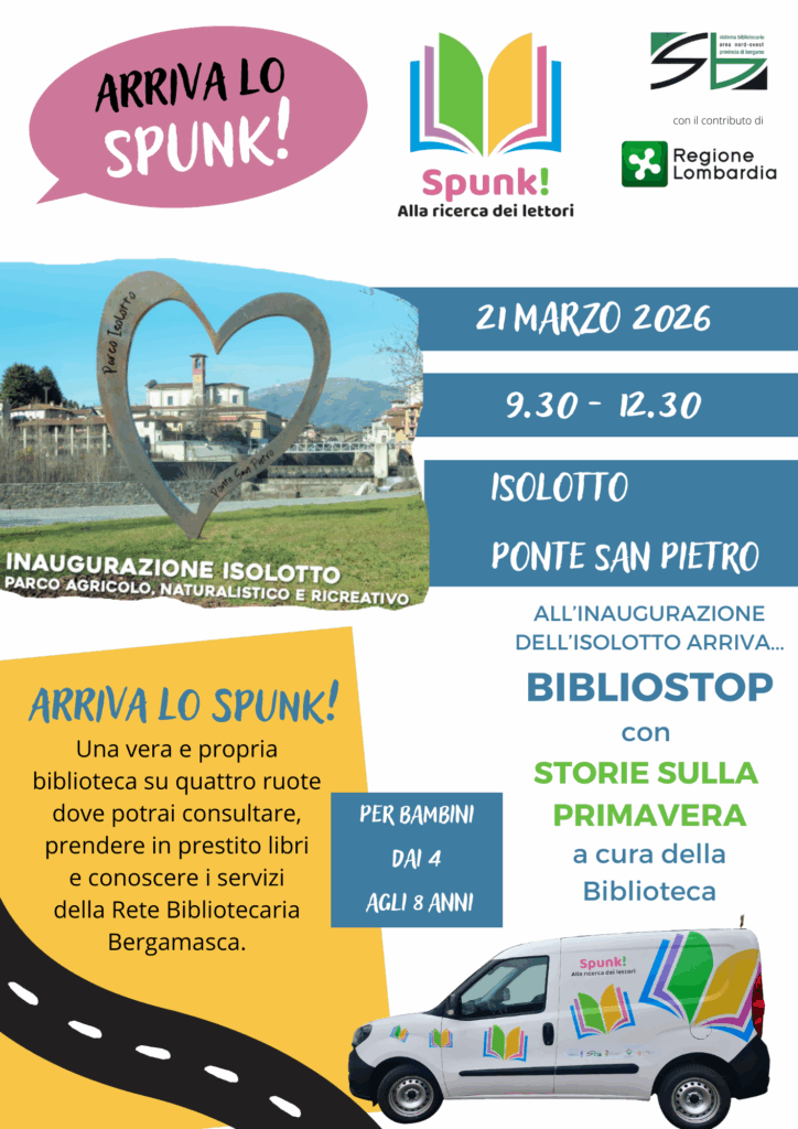 All’inaugurazione dell’Isolotto arriva… Bibliostop! Con storie sulla primavera a cura della Biblioteca. Una vera e propria biblioteca su quattro ruote dove potrai consultare, prendere in prestito libri e conoscere i servizi della Rete Bibliotecaria Bergamasca.