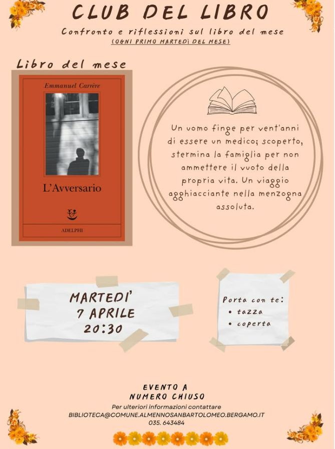📚 CLUB DEL LIBRO – Libro del mese Questo mese leggiamo “L’avversario” di Emmanuel Carrere✨ Un romanzo potente e inquietante che esplora una storia vera fatta di menzogne, identità costruite e il lato più oscuro dell’animo umano. Un libro che fa riflettere su verità, apparenza e fragilità. 📅 Martedì 7 Aprile 🕰 20:30 📍 Evento