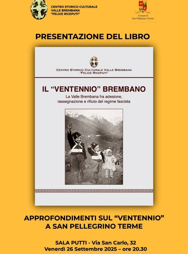 Accogliamo con entusiasmo la proposta del Centro Storico Culturale Valle Brembana “Felice Riceputi” e partecipiamo alla presentazione del volume IL “VENTENNIO” BREMBANO.. Venerdì 26 settembre ore 20.30, in Sala Putti – Via S.Carlo, 32 a San Pellegrino Terme.