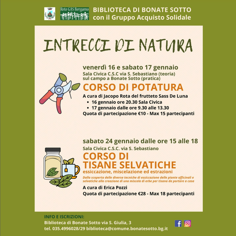 🌱🍵 CORSO DI TISANE SELVATICHE Un incontro dedicato al riconoscimento e all’utilizzo delle erbe spontanee per la preparazione di tisane. Dalla raccolta responsabile alla trasformazione, per riscoprire usi semplici e tradizionali, a cura di Erica Pozzi – sabato 24 gennaio dalle ore 15 alle 18 Sala Civica via S. Sebastiano Quota di partecipazione 28 euro